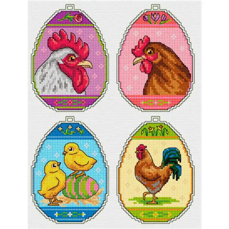 I disegni delle uova raffigurano galli, galline e polli. Presentano un anello nella parte superiore per poter appendere i disegni ricamati a qualsiasi parete. Ogni uovo di Pasqua misura 9 x 12 cm.