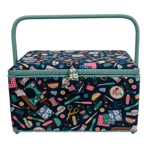 Scatola da cucito rettangolare, formato XL, con un design elegante e motivi “retrò”, ideale per chi ama il cucito, il ricamo o altri lavori manuali.