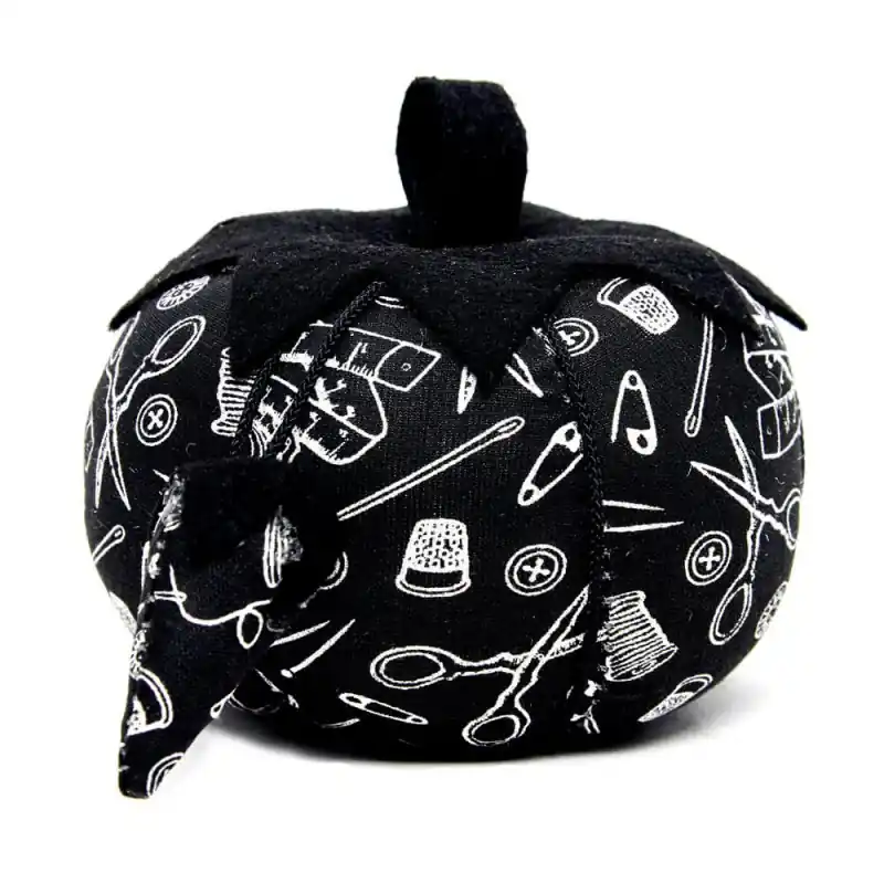 Il Puntaspilli a pomodoro di Hemline Gold presenta una divertente forma di pomodoro. È rivestito in stoffa in colore nero con motivi di cucito in bianco.