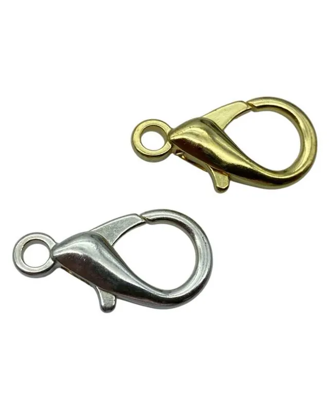 Gancio moschettone con chiusura a pesce (lobster clasp), resistente e pratico, realizzato in zama. Perfetto per bigiotteria fai da te, per la creazione di collane, bracciali, portachiavi e accessori handmade.