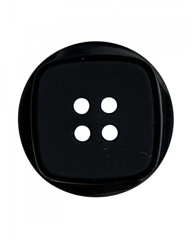 Descrizione prodotto: Bottone tondo piatto in plastica nera lucida, con disegno centrale a forma di quadrato opaco incassato. Presenta 4 fori disposti in griglia 2×2, ideali per cucitura classica. Design geometrico e moderno, perfetto per camiceria, abbigliamento casual, sartoria e accessori moda.