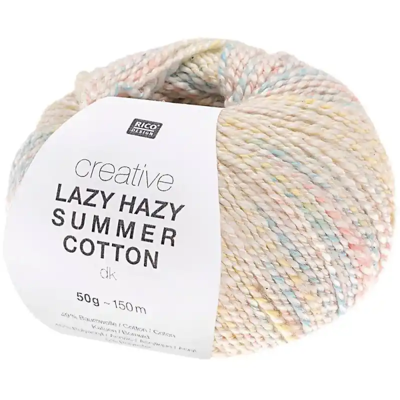 Rico Design Lazy Hazy Summer Cotton è un filato pieno di colore e consistenza, perfetto per tessere capi e accessori estivi con risultati meravigliosi. È composto da una miscela di fibre di cotone, acrilico e poliestere.