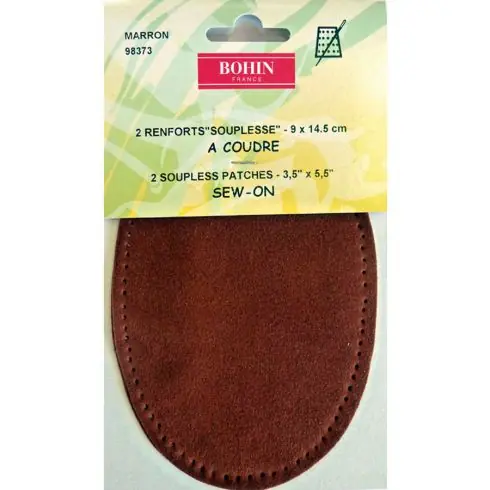 2 rinforzi elasticizzati da cucire in colore marrone, dimensioni 9 x 14,5 cm.