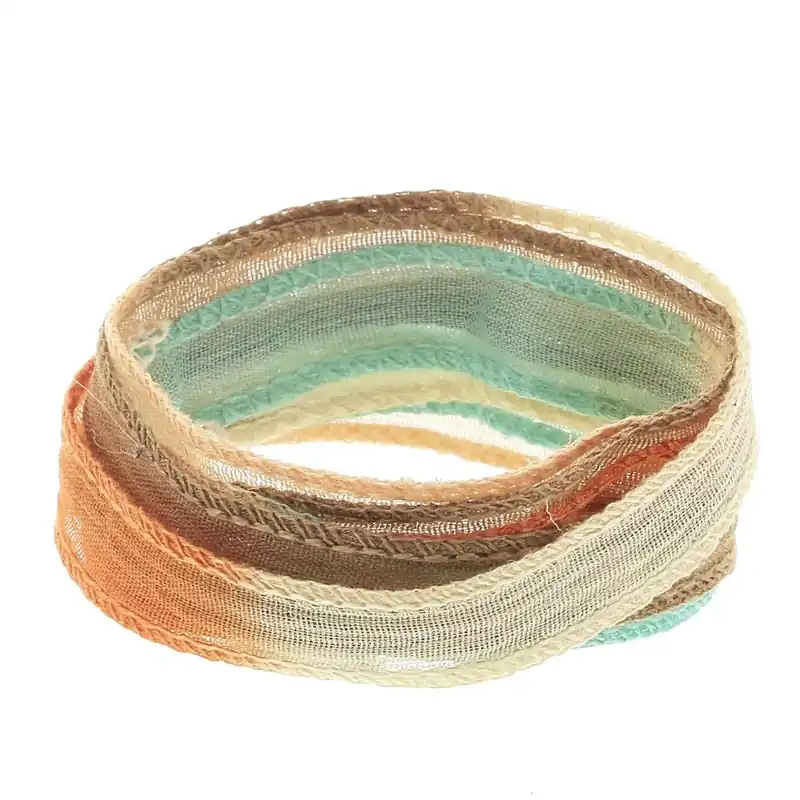 Laissez libre cours à votre créativité avec ce ruban de soie effet tie and dye bleu clair-marron-orange !