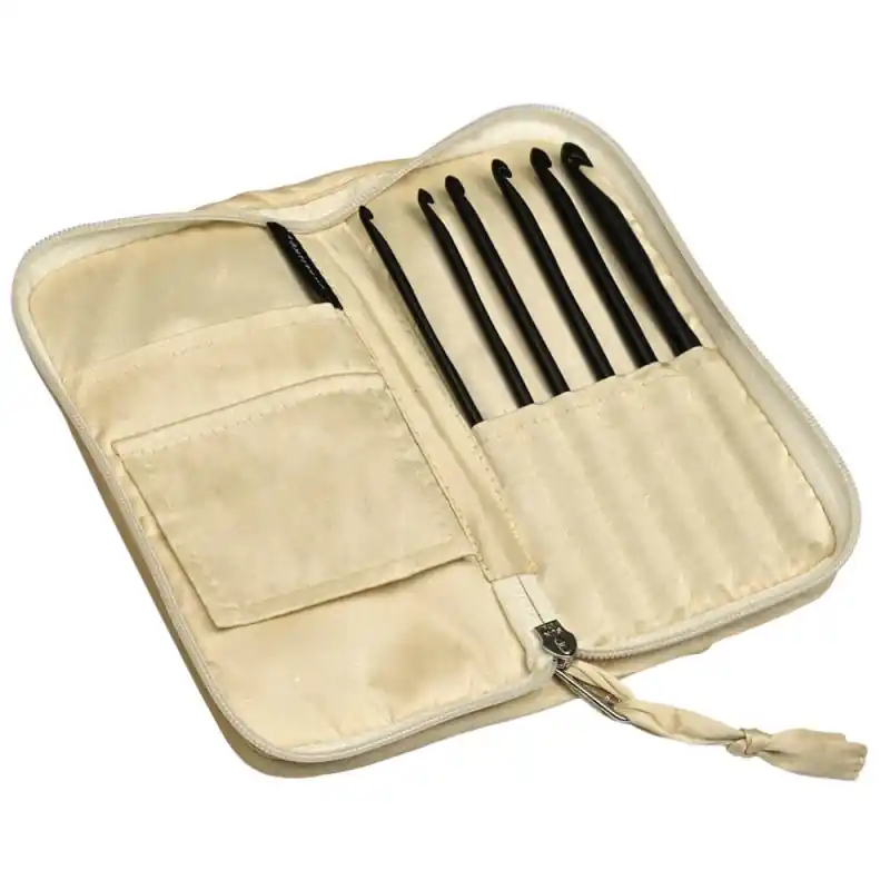 – Custodia in seta con diverse tasche per organizzare tutti gli accessori. - Uncinetti realizzati in legno di ebano.