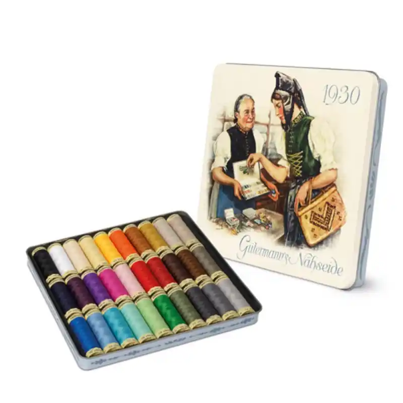 Il Set di fili Cucitutto di Gütermann Nostalgic include 30 rocchetti di filo adatto a qualsiasi tessuto o cucitura. Sono racchiusi in una bella scatola di metallo decorata con un’immagine dell’anno 1930 che raffigura due donne scegliendo fili da cucito. Perfetta idea regalo!