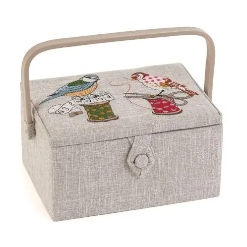 Scatola da cucito grigia con motivo “Uccelli”, un pratico accessorio per riporre tutti gli articoli di merceria e cucito.