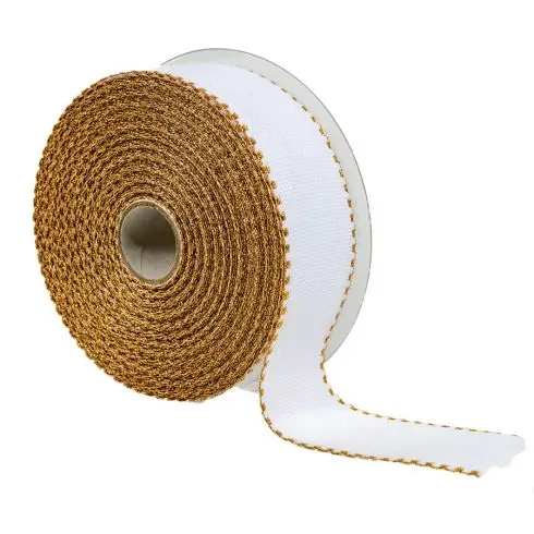 Galon in Aïda 6 bianco bordato d’oro LMC, larghezza 5 cm, venduto al metro.