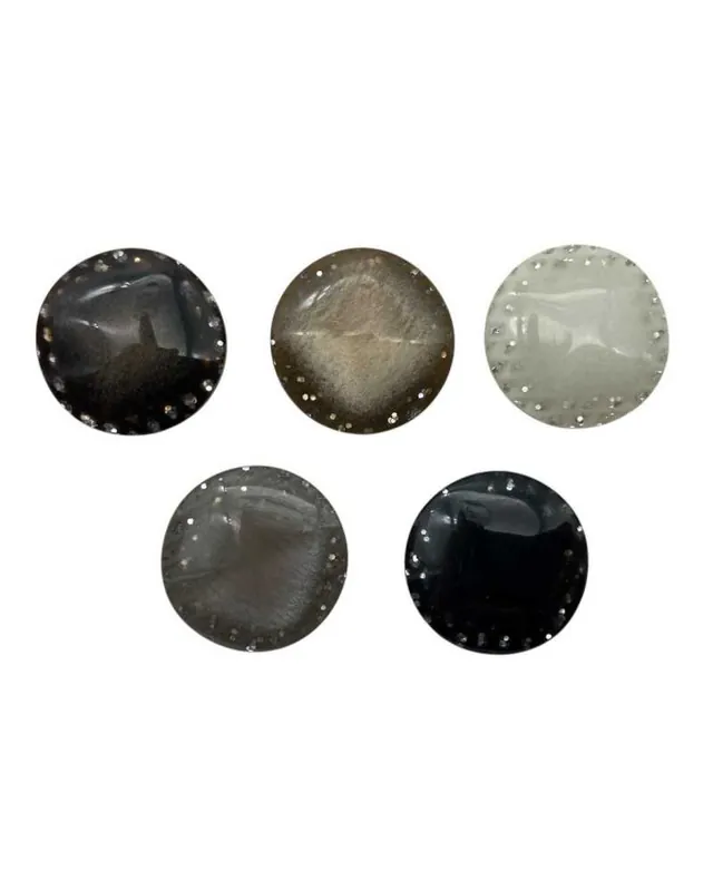 Un bottone decorativo dal look brillante e moderno, perfetto per giacche, abiti, camicette e accessori moda. La superficie bombata in poliestere è impreziosita da un bordo glitterato che cattura la luce e dona un tocco glamour a ogni cucitura.