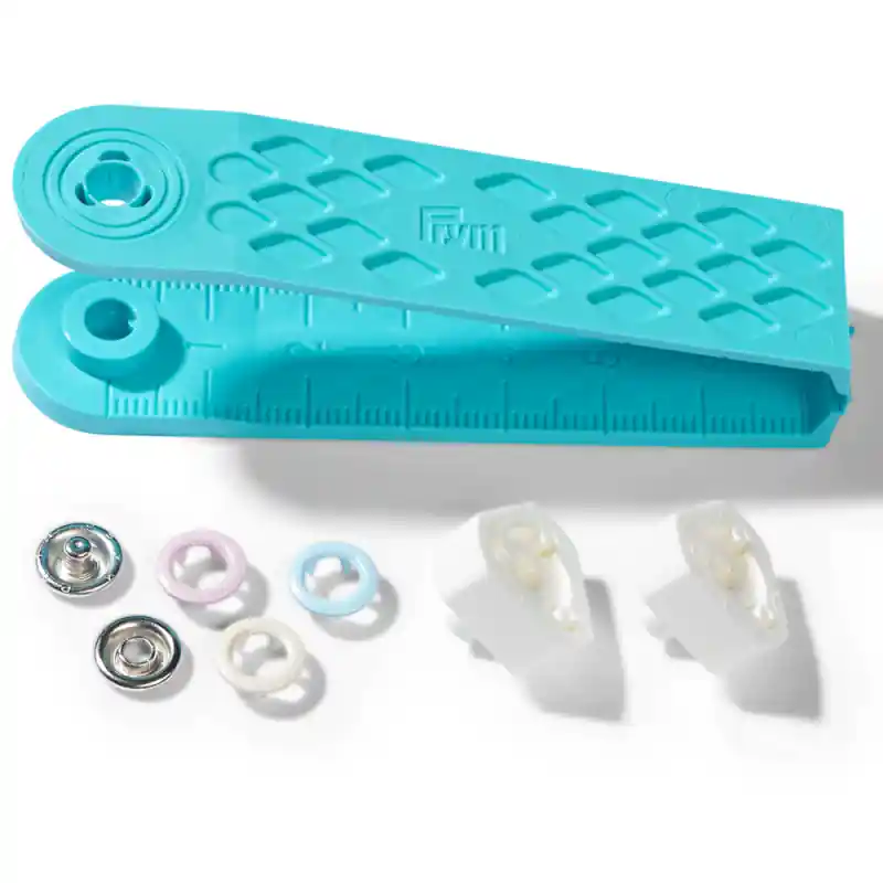 Questo set di Prym Love include anche la pinza per il montaggio dei bottoni a pressione sul tessuto.
