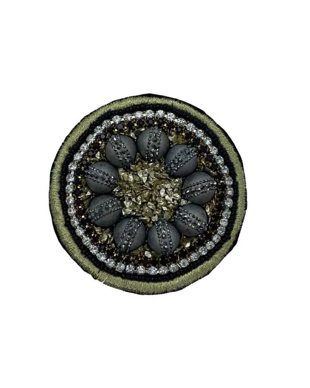 Applicazione termoadesiva rotonda della serie M, con strass, perle grigie e dettagli in oro, argento e nero. Diametro 6×6 cm. Il design elegante e scintillante dona un tocco prezioso e sartoriale a capi e accessori. Perfetta per personalizzazioni fashion, decorazioni handmade e progetti creativi di alta qualità.