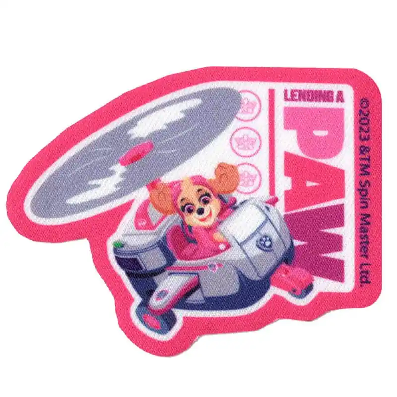 La sua applicazione è molto semplice con il ferro da stiro, senza bisogno di cucire. Il design mostra Skye, la coraggiosa cagnolina aviatrice di Paw Patrol, che pilota il suo elicottero su uno sfondo in tonalità di rosa accompagnato dalla frase Lending a Paw. Una toppa che combina tenerezza, dinamismo e lo spirito di aiuto che caratterizza l’eroina canina.