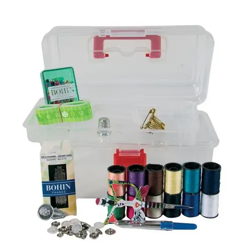Scatola da cucito completa in plastica trasparente bianca o rosa (a seconda della fornitura), con vassoio estraibile, dimensioni 20 x 11 x 11 cm, contenente :