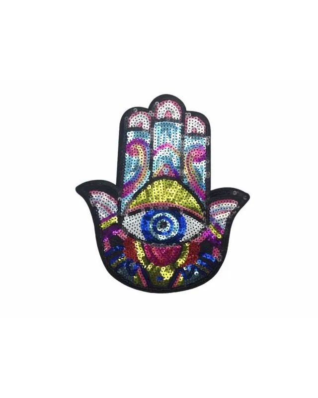 Spedito Oggi Applicazione Termoadesiva Patch Ricamata Paillettes Mano Fatima Hamsa 20×22 Cm