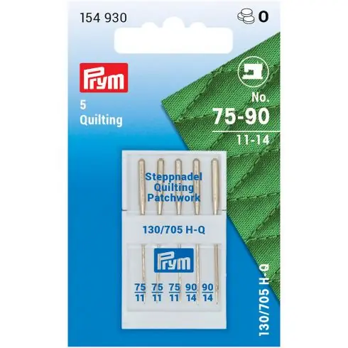 Astuccio in plastica su carta con 5 aghi di qualità superiore per macchina da cucire H-Q PATCHWORK 130/705, tacco piatto con punta fine.