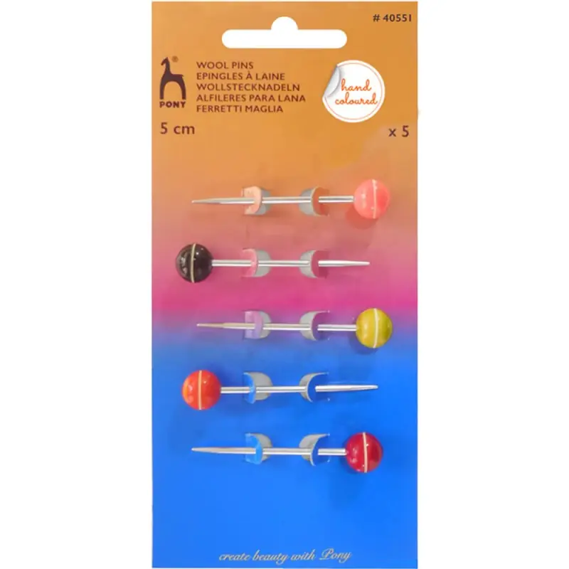 Gli Spilli con testa in legno di Pony aiutano a fissare e unire pezzi tessuti insieme per dare la forma giusta prima di cucire, nonché a chiudere scialli e altri capi in lana apportando un aspetto decorativo.