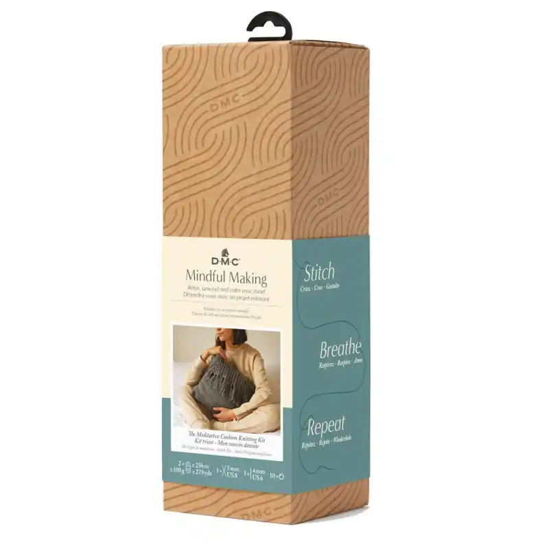 Il Kit di maglia – Il mio cuscino da meditazione della collezione Mindful Making di DMC è un set molto completo che include tutti i materiali e strumenti necessari per lavorare a maglia un cuscino quadrato in colore grigio. Il risultato è un adorabile e originale accessorio decorativo con frange.