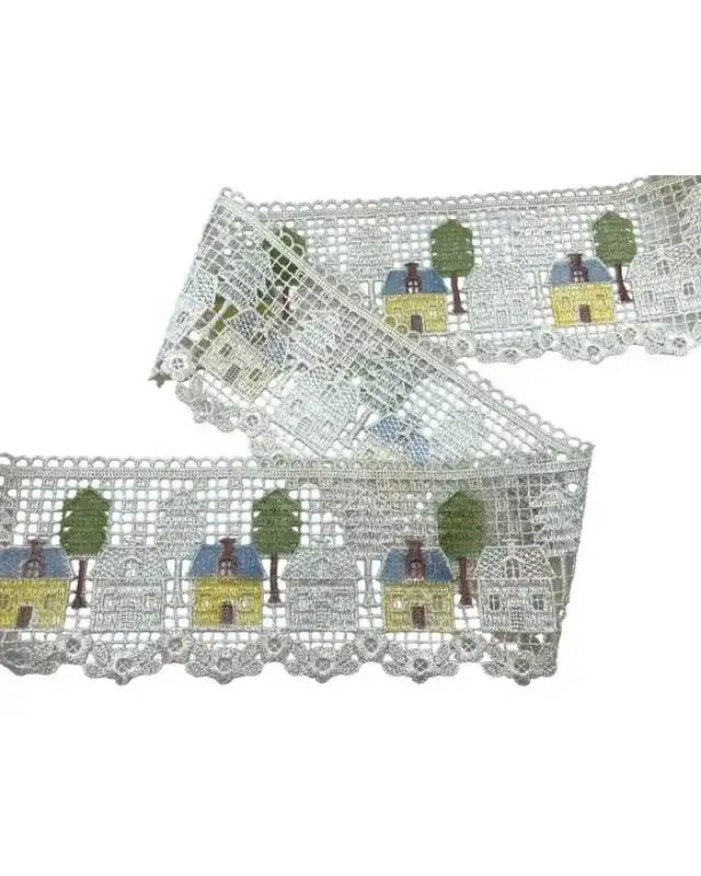 Passamaneria in macramè panna con motivo decorativo a casette e alberi, ideale per progetti creativi e decorazioni d’arredo dal gusto fiabesco.