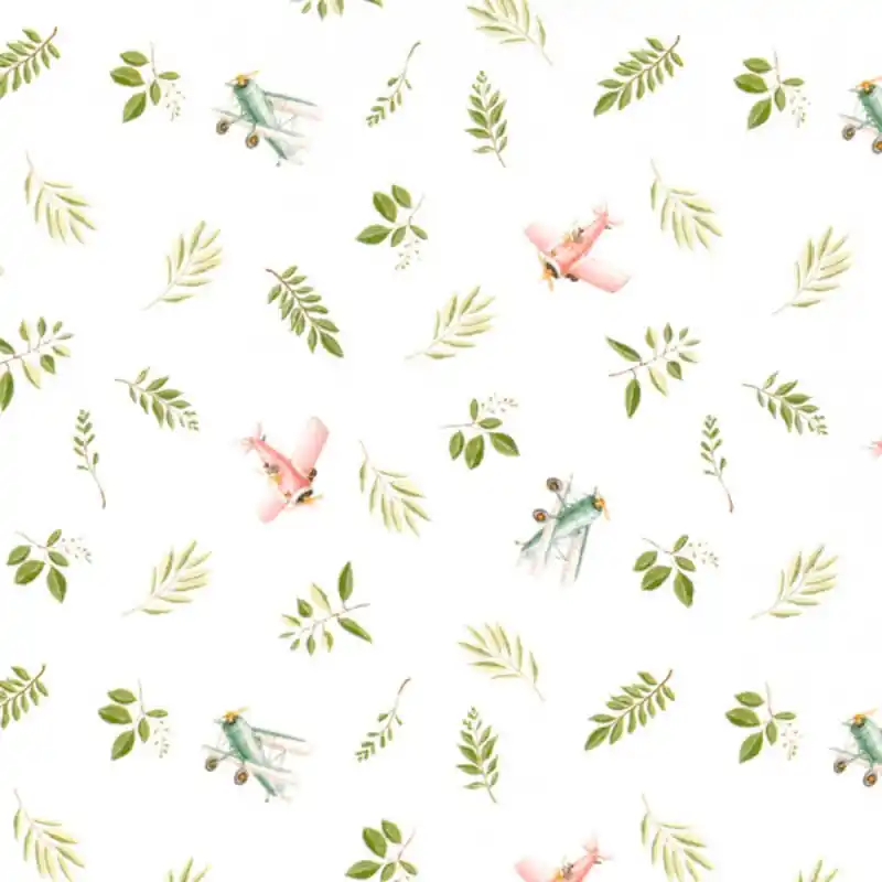 Il Tessuto in Cotone Aeroplanini e Foglie Verdi unisce dolcezza, leggerezza e un fascino naturale ideale per progetti infantili o decorativi. Il suo design presenta delicati aeroplanini vintage in tonalità morbide di rosa pastello e verde acqua, che sembrano volare tra rami e foglie verdi disegnate con uno stile ad acquerello. Lo sfondo bianco esalta la sensazione di freschezza e fa risaltare ogni illustrazione con un tocco tenero e rilassante.