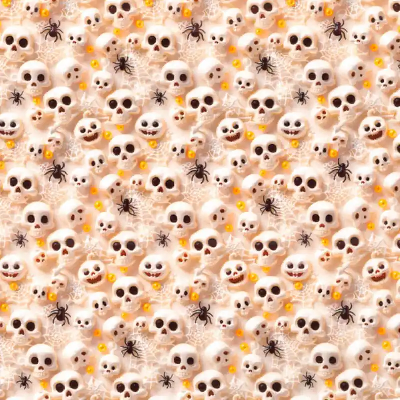 Questa spaventosamente adorabile Tessuto di Halloween presenta una stampa piena di piccoli teschi, ragnatele e ragni neri su uno sfondo chiaro che mette in risalto ogni dettaglio. La combinazione di toni crema, nero e tocchi di giallo la rende una scelta perfetta per coloro che cercano un design elegante ma divertente per la stagione più spettrale dell’anno.
