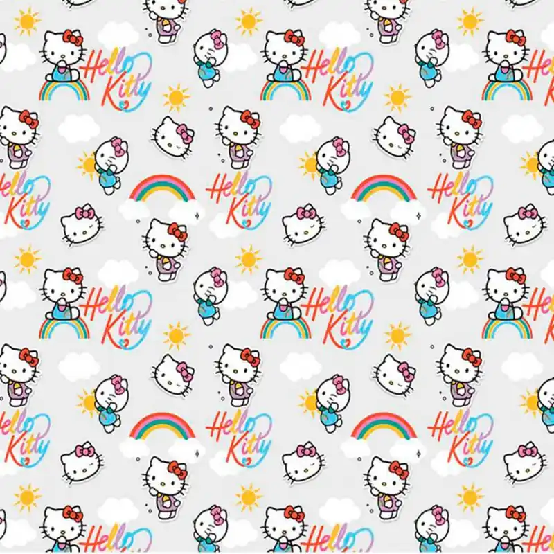 Questo tessuto si distingue per la sua stampa colorata e allegra, che raffigura la famosa gattina Hello Kitty intorno a carini motivi come arcobaleni, soli e nuvole. Un disegno infantile fantastico per i più piccoli!