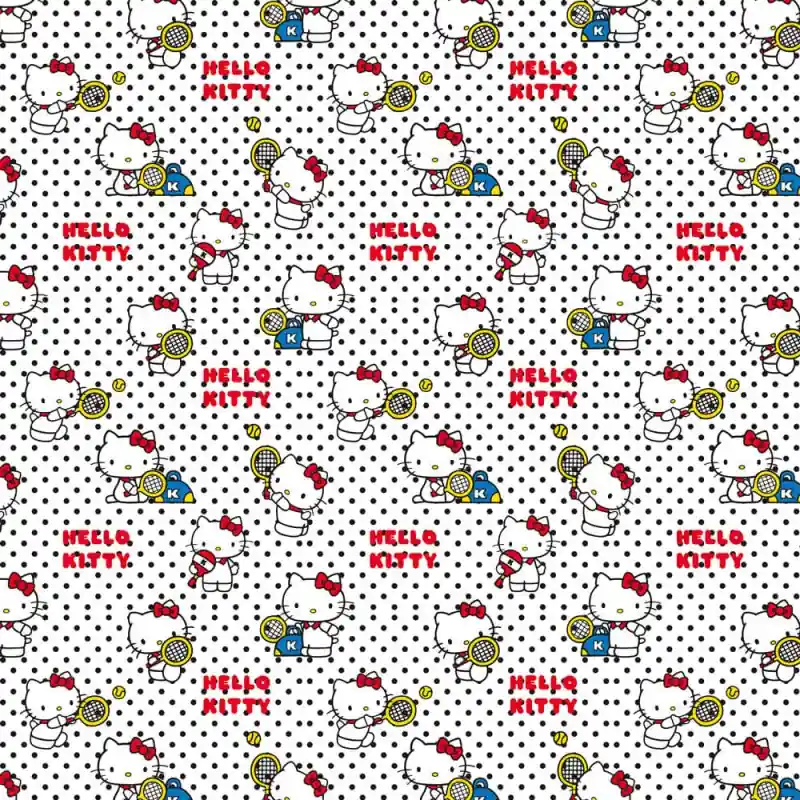 Il tessuto in bianco stampato a pois neri ritrae la gattina Hello Kitty praticando diversi sport con la racchetta: tennis e padel. Questa divertente fantasia aggiungerà colore e allegria ai capi fatti a mano. Lo stile infantile piacerà molto ai più piccoli!