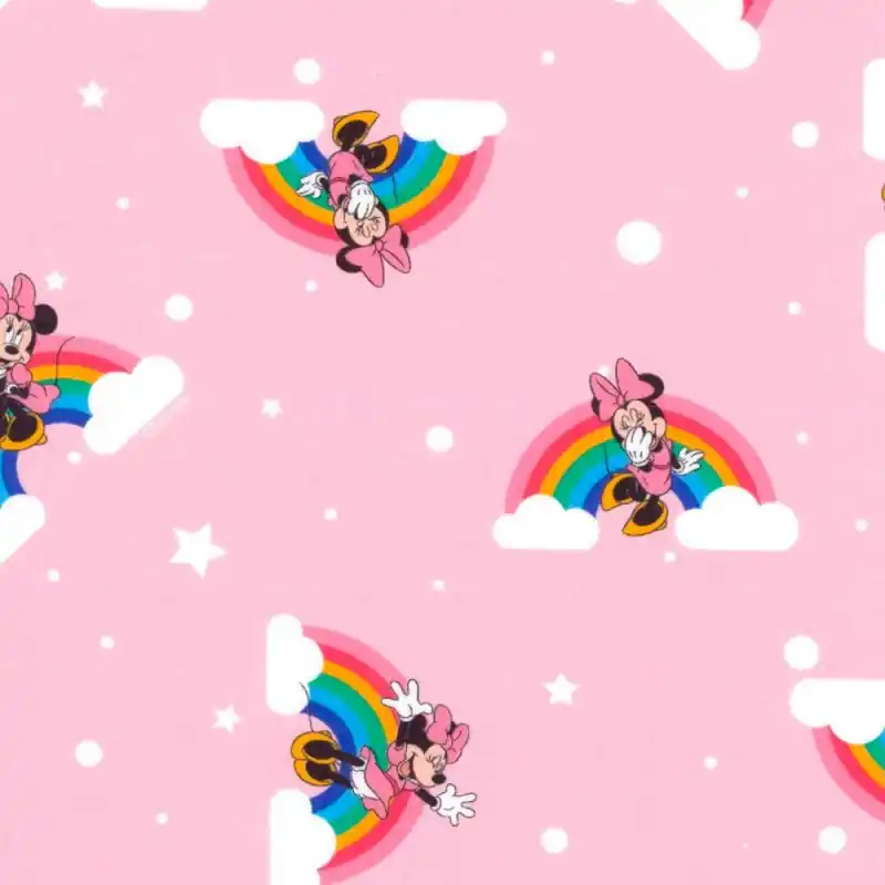L’adorabile stampa ritrae motivi di stelle, arcobaleni e la famosa topolina Minnie Mouse in diverse posizioni, su uno sfondo in colore rosa.