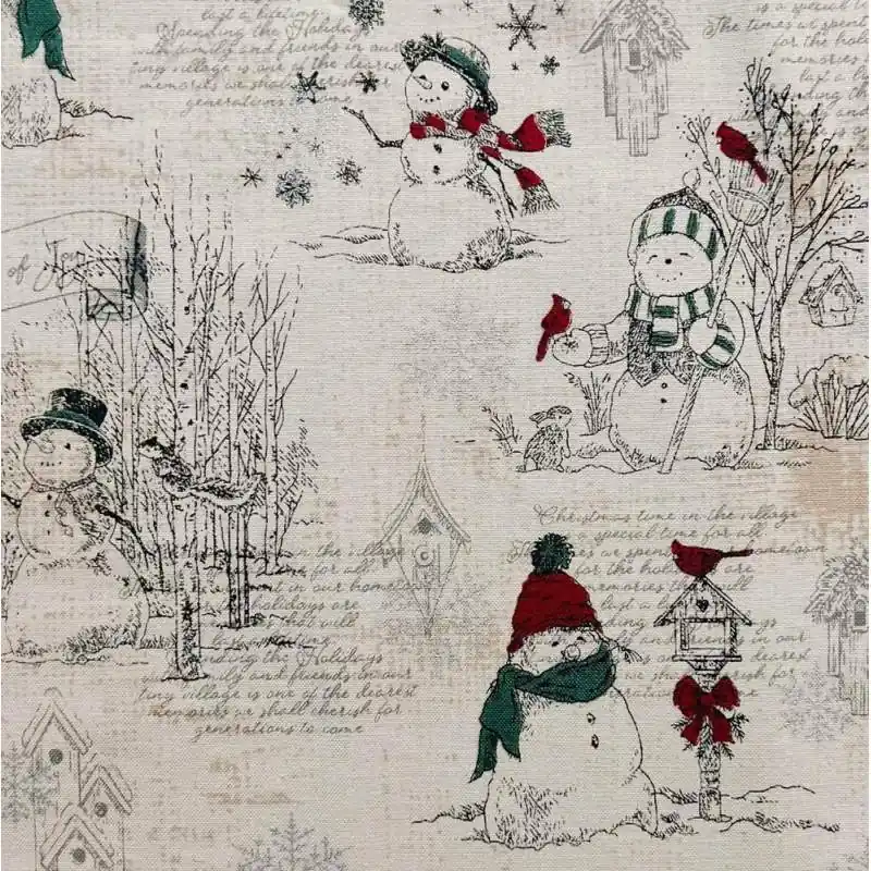 Tessuto invernale tortora con scene di pupazzi di neve e uccelli con fiocchi di neve argento Ultima Occasione
