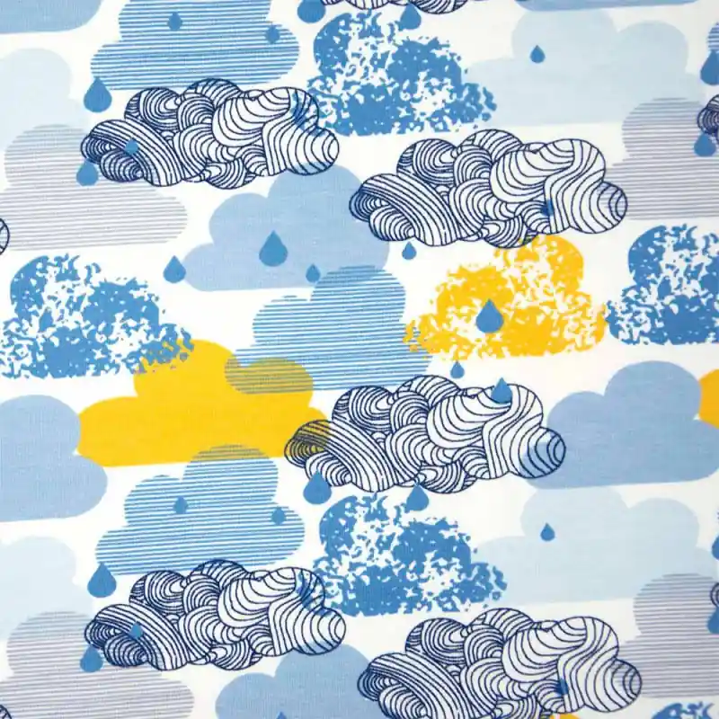 Il Tessuto Jersey Katia Be (B)Rain è divertente e originale. Presenta una stampa con nuvole in diversi stili e tonalità di blu, con gocce di pioggia e tocchi di colore giallo che offrono contrasto ed energia. Il design è ideale per capi di abbigliamento per bambini o per tutta la famiglia, con un tocco giocoso, moderno e pieno di movimento, perfetto per creare pezzi che trasmettano gioia anche nei giorni grigi.