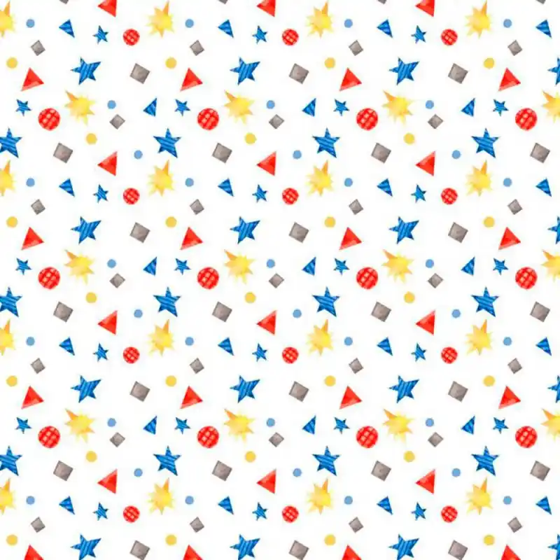 - Stampa geometrica con triangoli, quadrati, cerchi e stelle colorate su uno sfondo bianco.