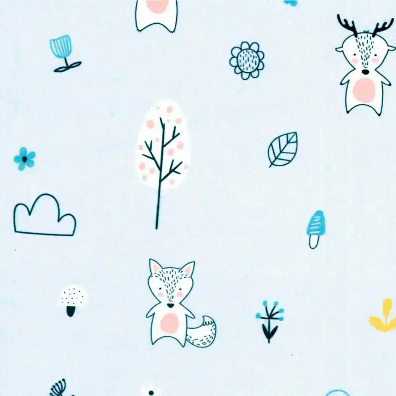 Il Tessuto popeline in cotone – Foresta è disponibile in due colori delicati: blu cielo e verde. Il disegno raffigura volpe, alberi, fiori e altri motivi originali.