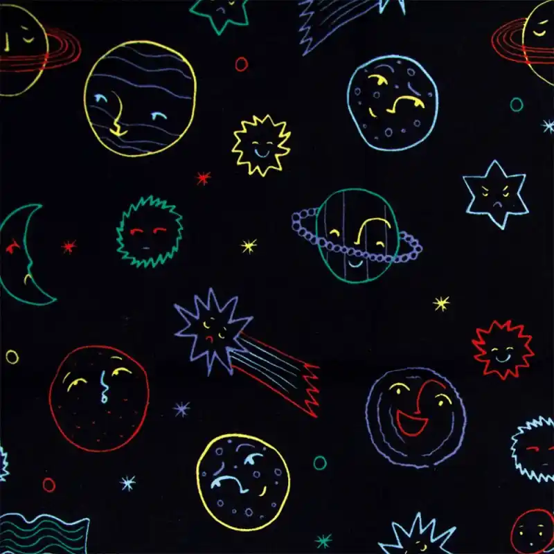 Il Tessuto Popeline Katia – Galaxy Emotions ti trasporta in un universo pieno di colori, con una stampa di pianeti e stelle dai colori vivaci, che risaltano su uno sfondo nero. È realizzato in cotone di alta qualità, che garantisce morbidezza e comfort sulla pelle.