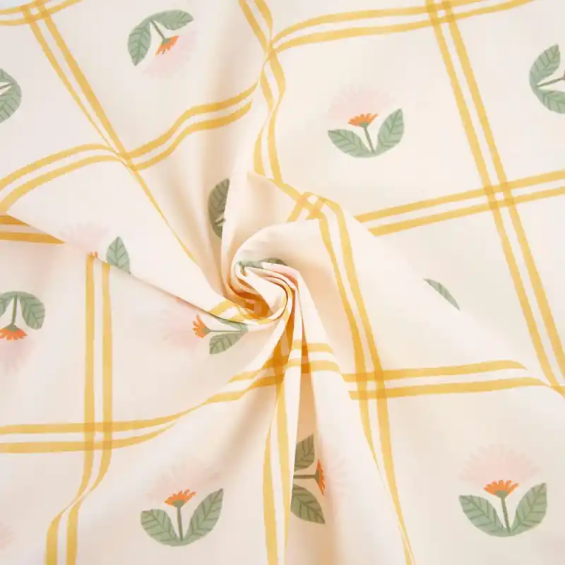 Il Tessuto Impermeabile Raincoat PU Print Tuscan Rain di Katia Fabrics unisce funzionalità e ispirazione naturale. Il suo design presenta una griglia color senape su sfondo chiaro, decorata con piccoli fiori nei toni del rosa, verde e arancione, evocando il calore e l’armonia dei paesaggi toscani.