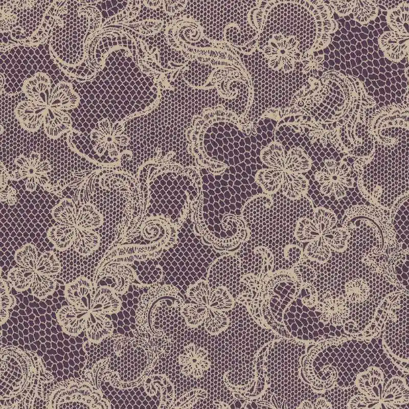 - Tessuto fondo viola con decorazioni in stile arabesco, quadrifogli e altri fiori.