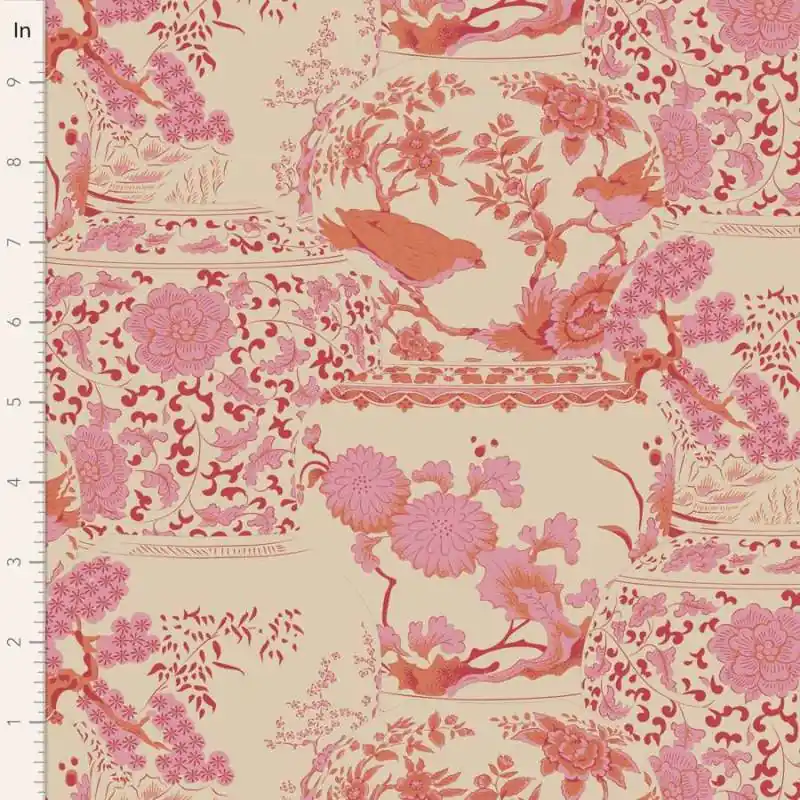 - Tessuto panna con vasi rosa decorati con fiori e uccelli
