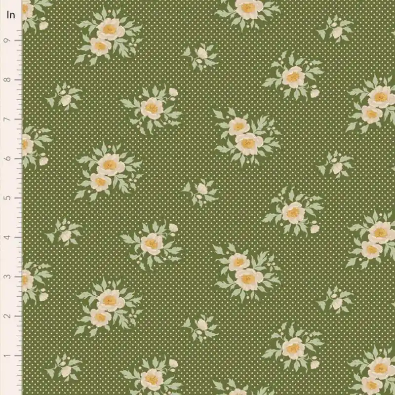 Tilda Merry Little Christmas, Joy Pine, tessuto con fiori e pois su fondo verde pino Occasione Imperdibile