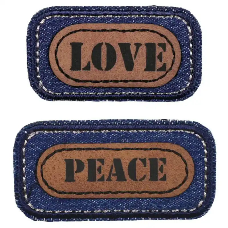 Il Set di Toppe Love di Prym è perfetto per aggiungere un tocco urbano, rilassato e con un messaggio ai tuoi capi e accessori. Include due toppe termoadesive con sfondo in tessuto denim e lettere nere su imitazione pelle marrone, con le parole LOVE e PEACE.