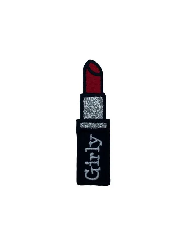 Applicazione Patch Termoadesiva Ricamata Nero Rossetto Rosso Glitter Argento Scritta Girly Bianco 8×2 Cm