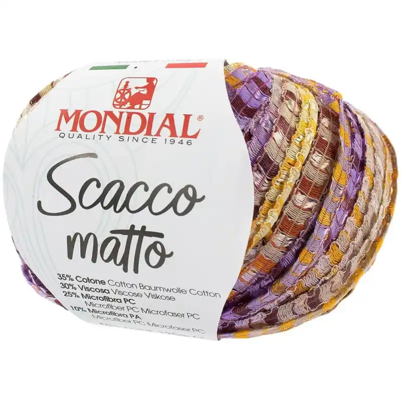 Scacco Matto di Mondial è un filato molto speciale. Presenta una fettuccia dalla consistenza unica realizzata a telaio. È composto da un misto di fili in diversi toni andando a creare un effetto colorato bellissimo e accattivante che ricorda un caleidoscopio.
