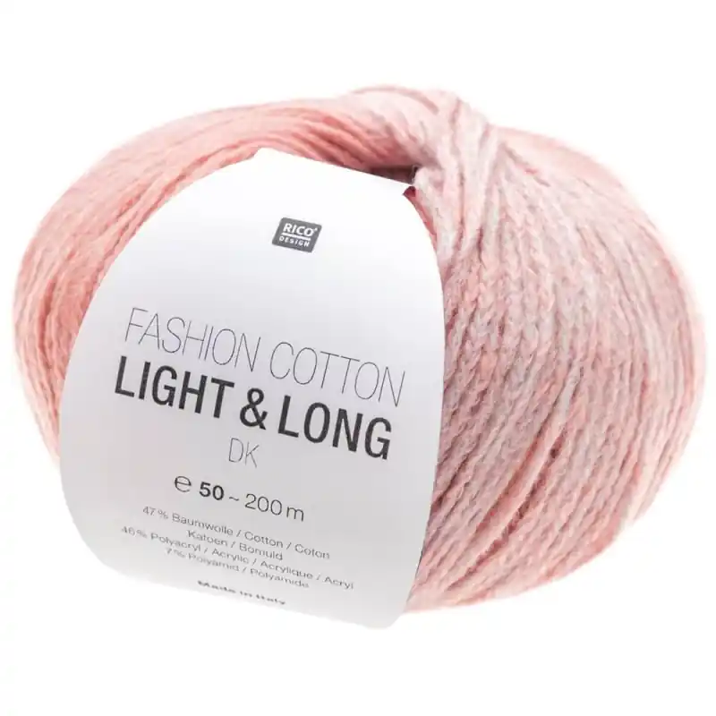 Rico Design Light & Long DK è un filato soffice, voluminoso ma meravigliosamente leggero. È composto da una miscela di cotone con acrilico e poliammide, filato per ottenere la massima morbidezza.