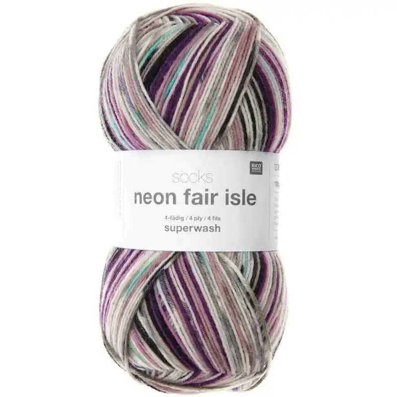 Rico Design Socks Neon Fair Isle 4-ply è un filato vibrante progettato per la lavorazione a maglia di calzini e altri progetti che richiedono un tocco di colore brillante. Ideale per creare calzini con un motivo Fair Isle o Jacquard, questo filato permette di ottenere un design colorato senza la necessità di cambiare fili.