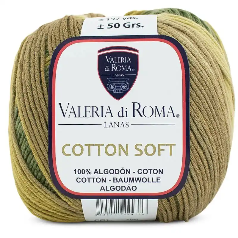 Cotton Soft Stampa de Valeria di Roma es un hilo de algodón de grosor fino, disponible en colores matizados, que ofrecen tejidos rayados con líneas gruesas más o menos definidas, separadas por dos líneas más finas en diferente color.
