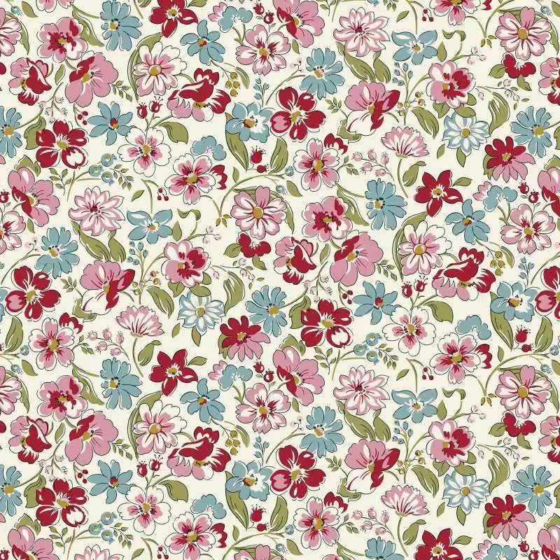 Vendita Finale Heirloom 4 Collection, Floral Joy, tessuto bianco con piccoli fiori rosa, rossi e azzurri – Liberty Quilting
